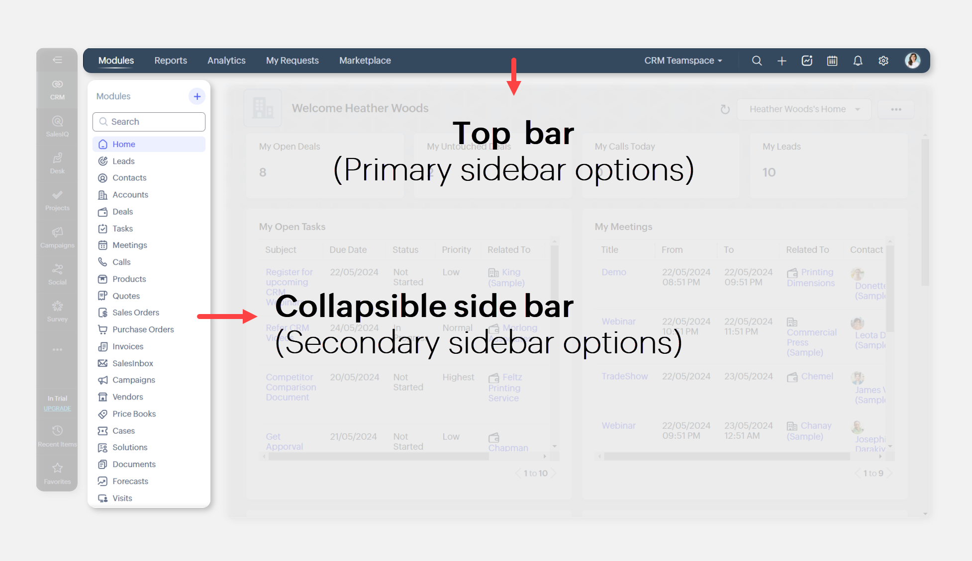 In both CRM Plus and Zoho One, the primary sidebar is at the top, and the secondary sidebar will be right next to the CRMPlus/Zoho One left menu, which can be collapsed to maximize your main pane.